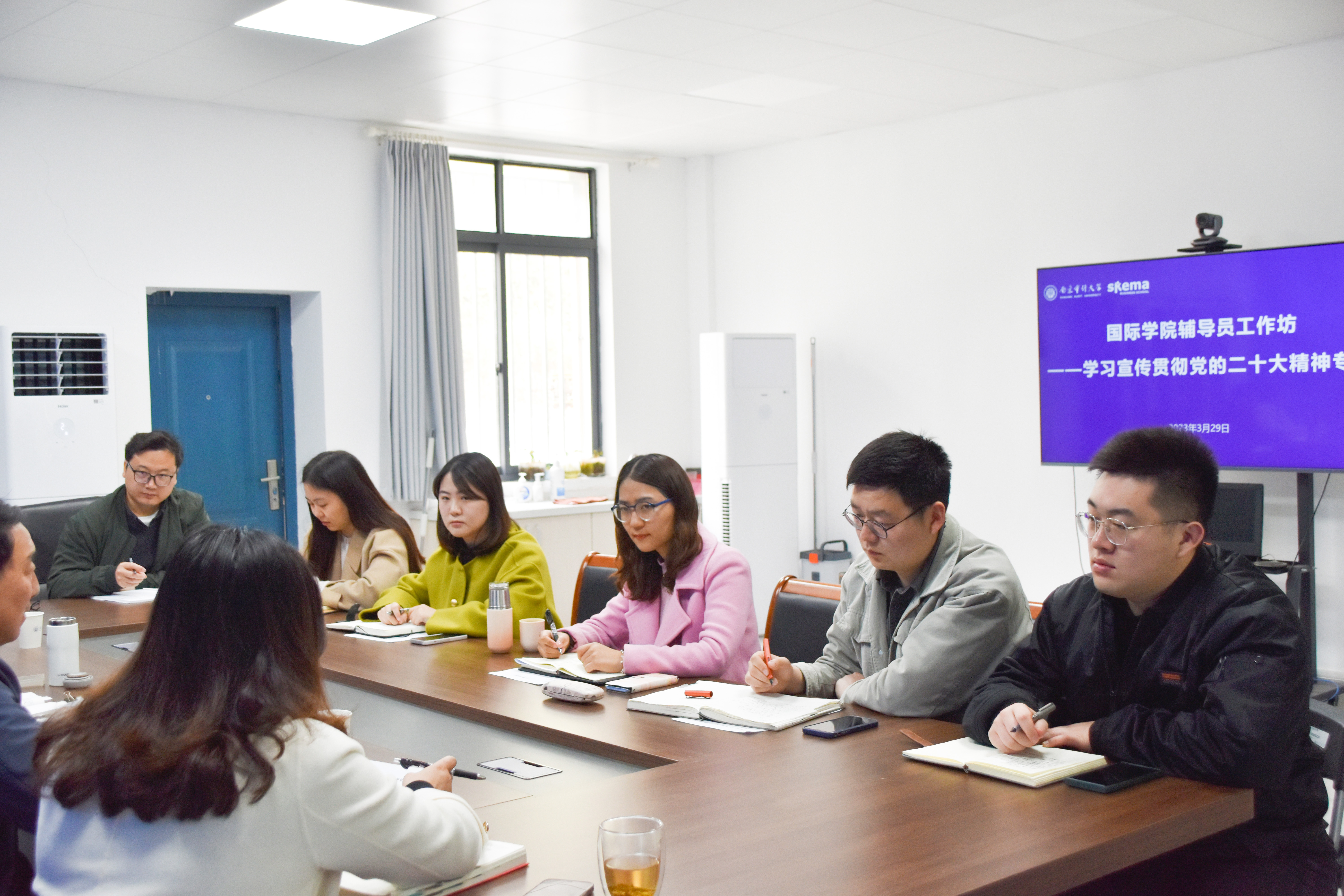 为深入学习贯彻党的二十大精神,推动辅导员队伍先学先研先讲,将党的二十大精神内化于心、外化于行,3月29日上午,国际学院在学务大厅会议室举办了2023年第一期“辅导员工作坊”。校老同志二十大精神宣讲团成员郭宏之老师、国际学院辅导员成长导师王丽琳老师、国际学院党总支书记姜德波、副书记、副院长王静以及全体辅导员参加了工作坊,工作坊由姜德波主持。