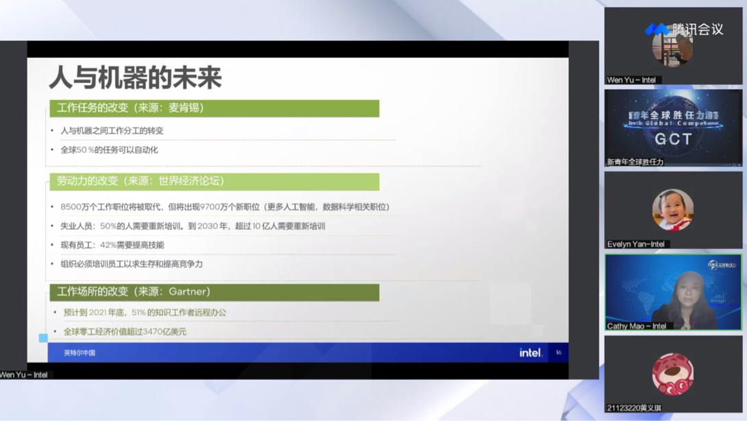随后,毛琴着重强调了人与机器的未来发展趋势。她认为,随着科技的进步,机器将会承担大量的人类工作,旧的工作职位将被人工智能所代替,人类的部分能力,例如手工能力,认知能力和情感能力会因此而退化,但同时也会产生新的职位需求,所以员工必须经过培训来增强职场竞争力。另外,科技的进步也会带来工作场所的改变,一半的知识工作者将会实现远程办公。总的来说,青年大学生应该拥抱科技,拥抱变化,不断探索,勇于自我迭代。
