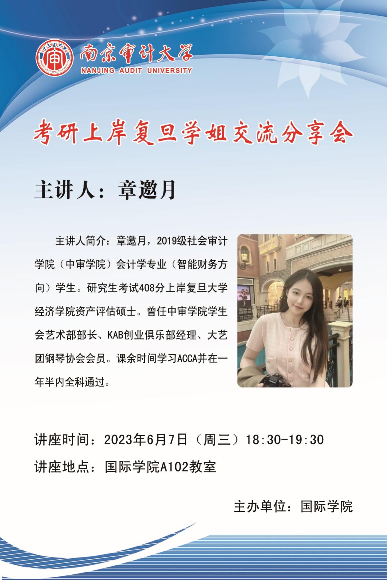 6月7日下午,国际学院开展了一场干货满满的考研经验交流会,UG环球360官方网站有幸邀请到了19级章邀月学姐(研究生考试上岸复旦大学经济学院资产评估硕士)为UG环球360官方网站学生进行考研经验分享。