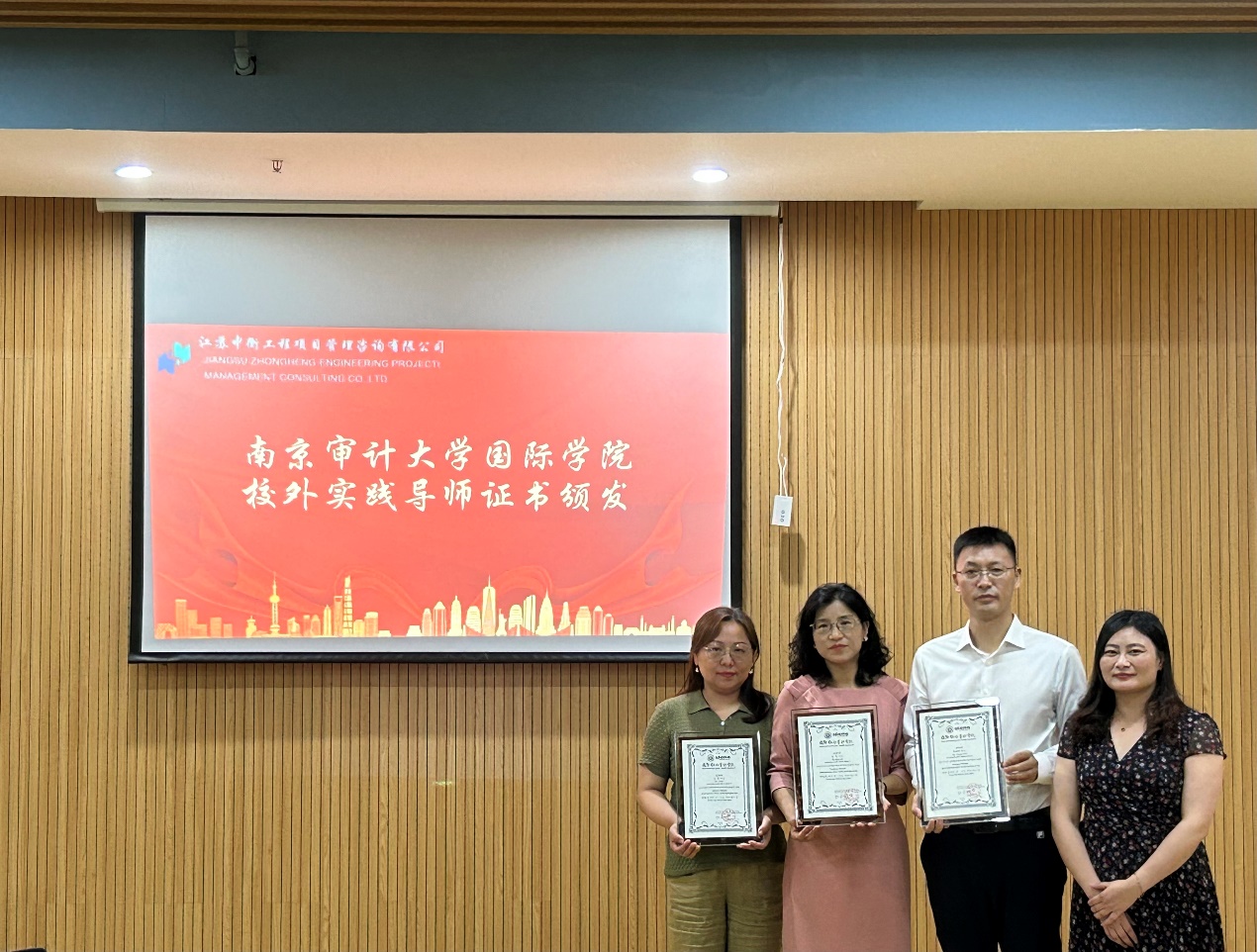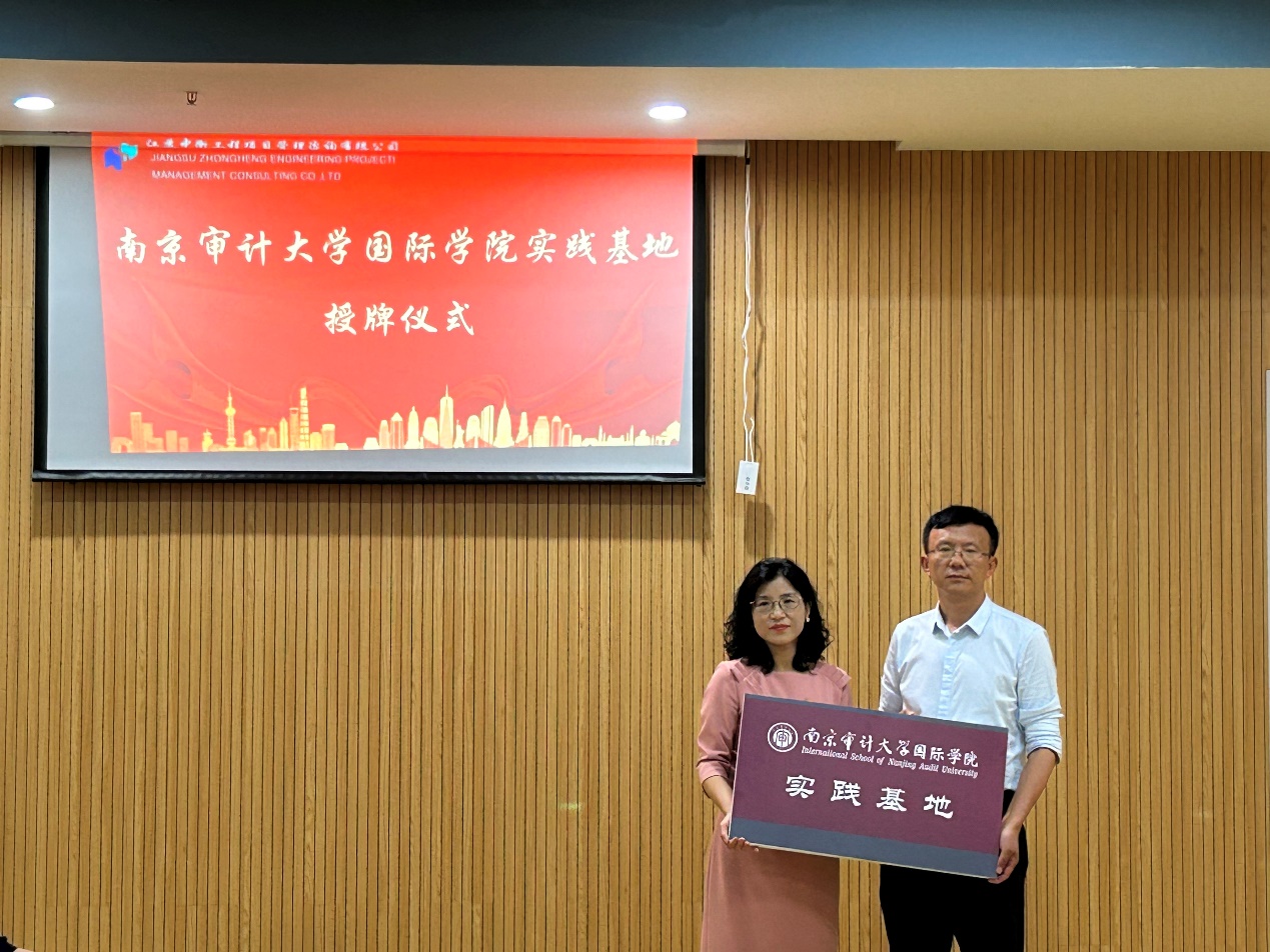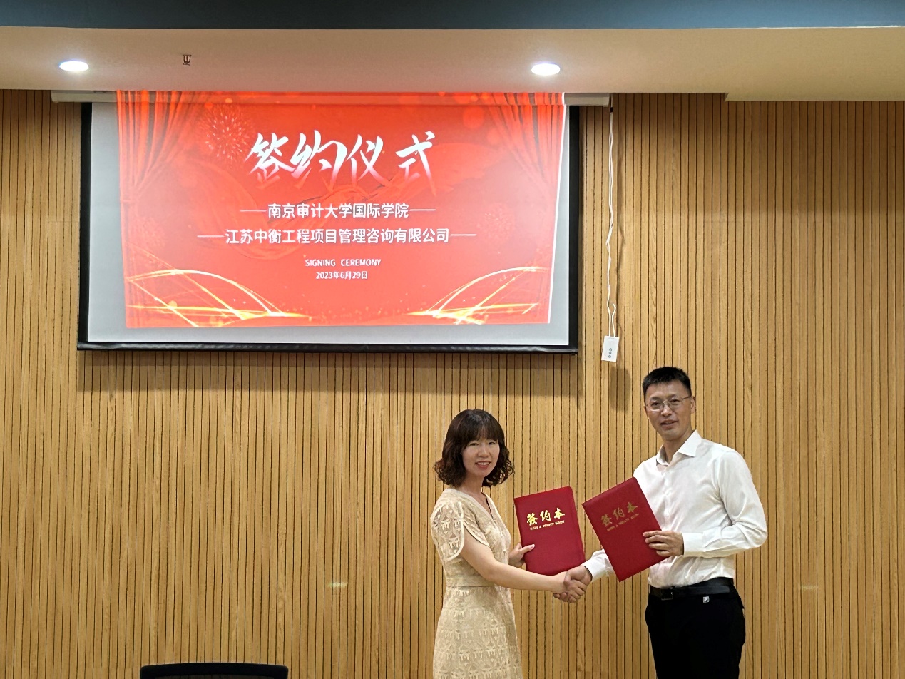 双方就工程审计实务、实习实践方案、产教研融合等方面进行了深入交流。江苏中衡工程项目管理咨询有限公司董事长孙精学与国际学院副院长张文秀(主持)签署“校企合作协议书”,学院党总支书记江振春为江苏中衡工程项目管理咨询有限公司“实践基地”授牌,学院副书记、副院长王静颁发校外实践导师聘书。