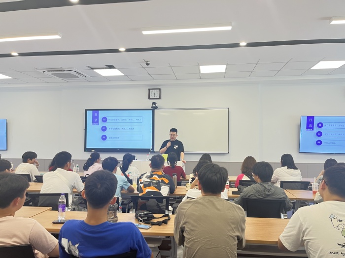 丁一、赫鸿雁老师对全体新生表示了热烈又真诚的欢迎,随后两位老师进行了简短的自我介绍,他们从学业规划、校纪校规、防诈骗三个方面为同学们的学习生活作出了指导。丁一老师指出大一阶段主要是基础课程的学习,同学们要调整好心态,转变高中的应试教育学习模式,增强学习的自主性,同时切忌盲目报班考证。