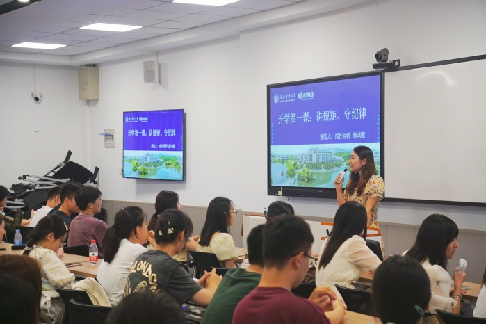 赫鸿雁老师向同学们解读了《学生手册》里的校纪校规,贯彻诚信教育理念,希望同学们端正考风考纪,养成良好的学风与学品。最后,两位老师结合往届学生和身边亲友所碰到的真实案例着重强调了在新生时期容易出现的一些诈骗手段,警示同学们要防范电信网络诈骗,提高反诈防骗能力。