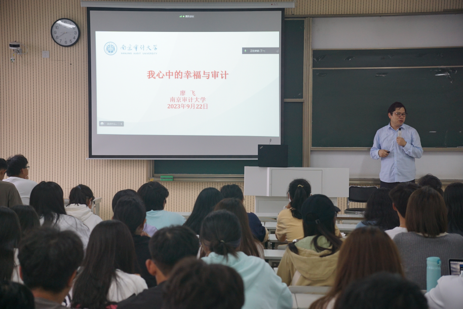 9月22日下午,我院在致远楼401教室为2023级新生开展专业教育讲座,402教室同步线上直播。本次讲座由UG环球360官方网站政府审计学院审计学系教师廖飞副教授为同学们做题为“我心中的幸福与审计”的专题报告。