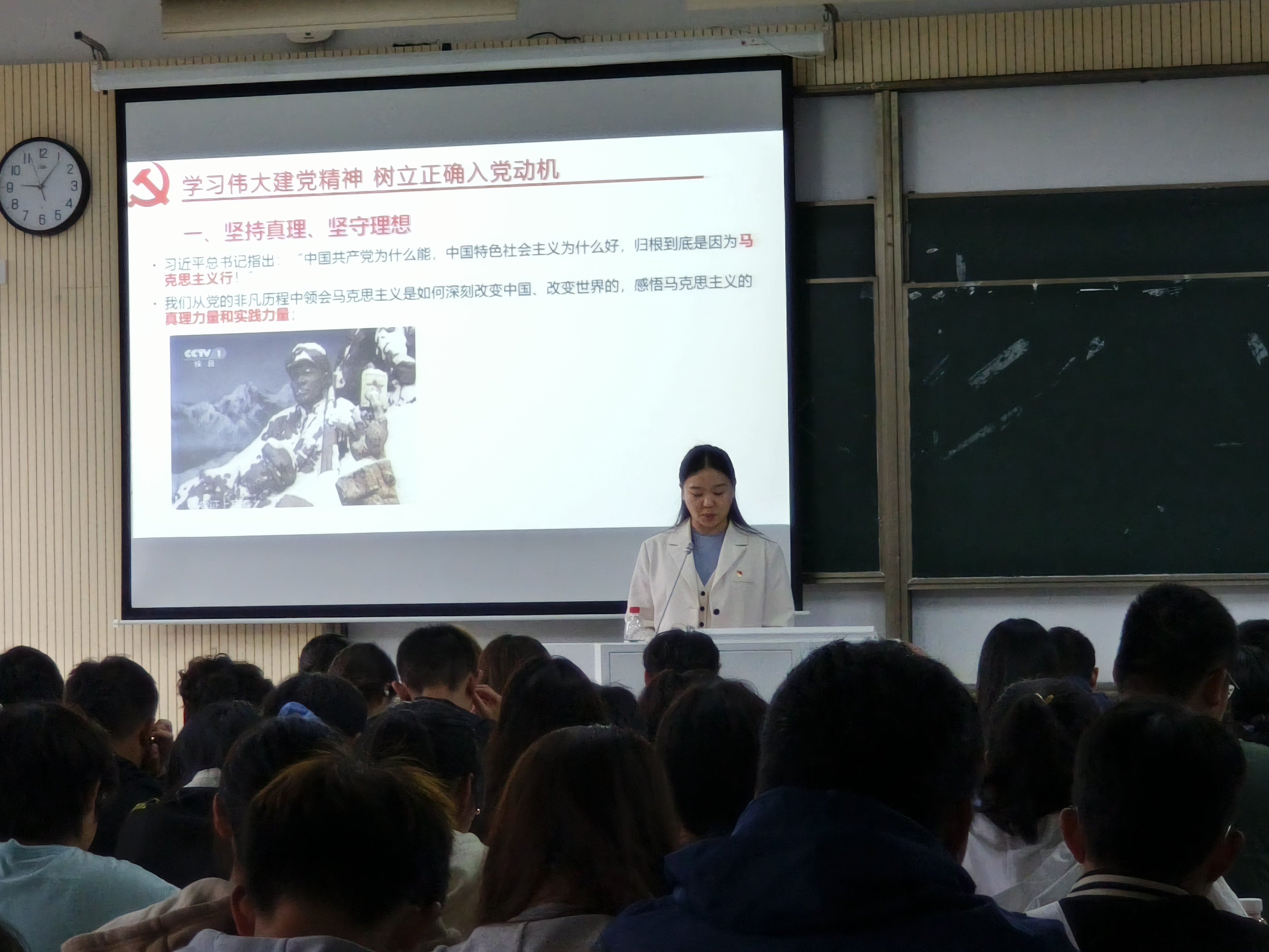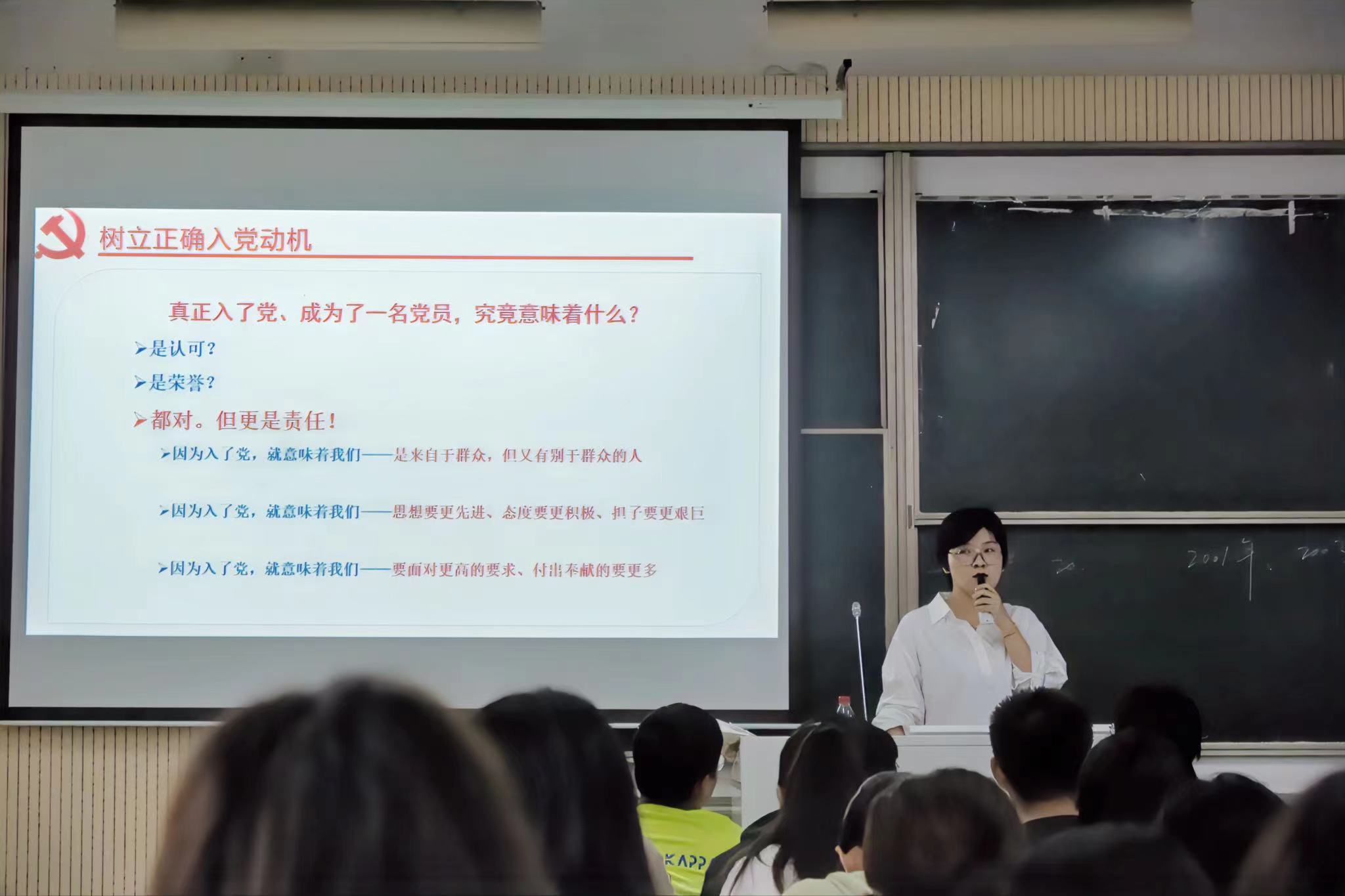 尹曦首先用百年前的建党小故事巧妙切入主题,深刻阐述了“坚持真理,坚守理想”的重要性,呼吁同学们坚定理想信念。接下来,尹曦提出“什么是入党动机”的问题,引发同学们思考,并结合自己身边的学生入党案例,向同学们讲述了端正入党动机的重要性。她强调指出,端正入党动机是争取入党的首要问题,要自觉摒弃不正确的、功利化的入党动机,真正把个人理想与实现中华民族伟大复兴的中国梦结合起来。随后,她提出了“怎样端正入党思想”“成为了一名党员究竟意味着什么”等问题,向同学们阐释了党员的责任与义务,明确了入党积极分子的具体条件和要求。最后,尹曦老师展示了一份入党申请书范文,鼓励同学们积极向党组织靠拢,希望同学们树立远大理想,勇担历史使命,锤炼过硬本领,践行好强国有我的青春誓言。