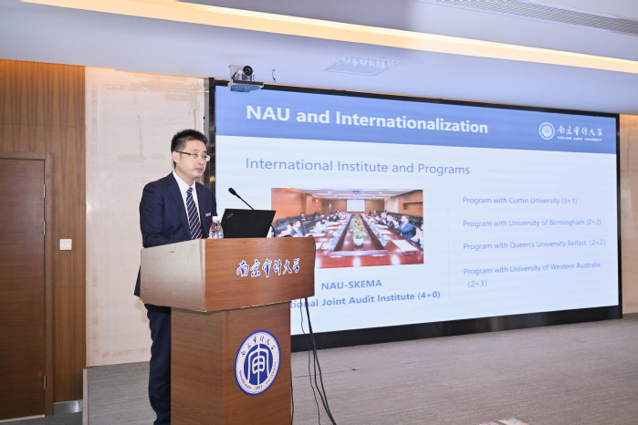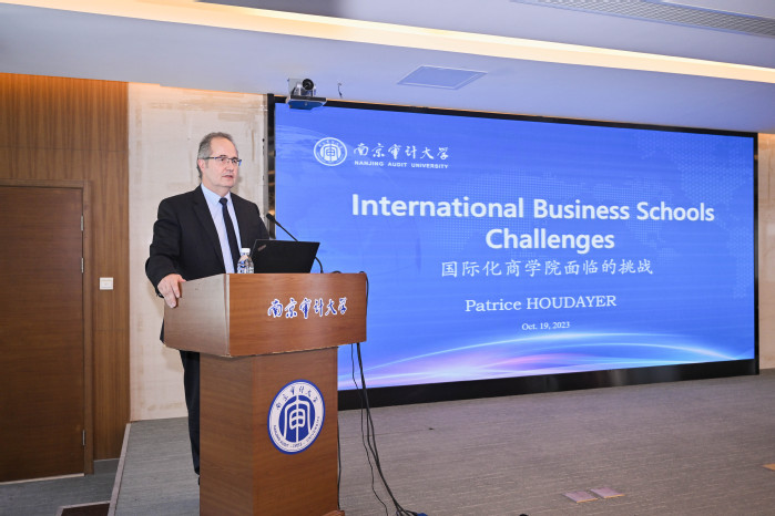 帕特里斯•乌达耶以“国际化商学院面临的挑战”为主题,介绍了在复杂多变的全球化环境下,国际化运作的商学院面临各式各样挑战,他指出,当前,加速发展的全球社会为教育工作者和学生都带来了巨大的挑战。人工智能技术发展飞升,使得教育工作者面临被取代的风险,而青年学生则要面对来自全球的朋辈的竞争压力。因此,无论是教师还是学生,无论是在教学中还是在学习中,都需要提升全球竞争力,在国际交流中获得更多启迪。乌达耶鼓励国际联合审计学院学生积极提升全球视野,既可与法国SKEMA商学院来南审交换的学生交流,也可参加交换项目,赴SKEMA商学院全球校区交换学习。