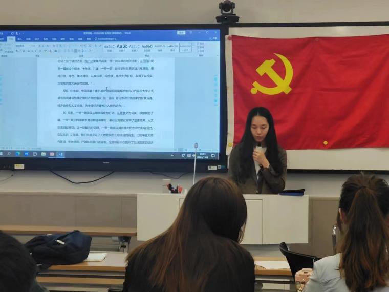 主讲人张朱甜带领全体党支部成员进一步探讨“一带一路”政策持续进步、成就璀璨的发展历程,分享人郭欣然进一步总结补充张朱甜同志宣讲的核心重点。