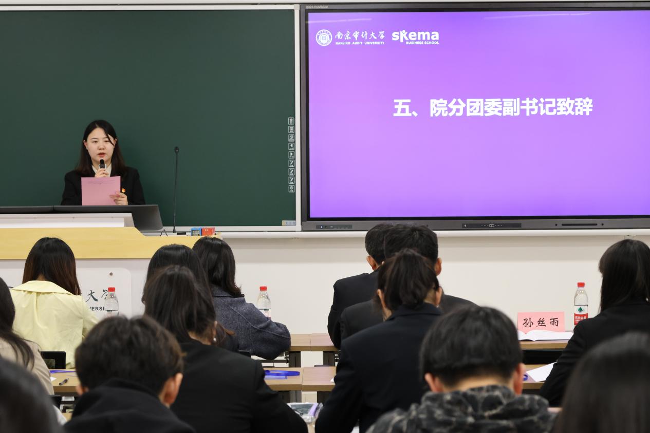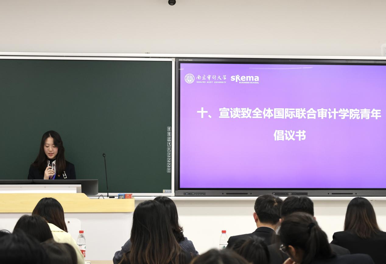 最后,常任代表会议候选人沈尤佳同学上台宣读了致全体国际联合审计学院青年倡议书,倡议学院全体青年牢记嘱托,胸怀祖国,用青春托起中国梦,亦要勇往直前,开拓创新,用行动提升实践能力,更要学会放眼国际,彰显风采,向世界讲好中国故事。