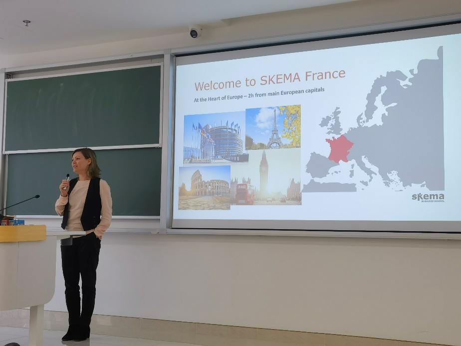 11月29日下午,国际联合审计学院邀请SKEMA商学院全球BBA项目总监Dr. Yan GRASSELLI和国际学生办公室Alexandra JONSSON-LECLERC作主题为“Welcome to SKEMA Business School Sophia Antipolis Campus, France 欢迎来SKEMA商学院索菲亚安提波利斯校区学习”的讲座,就在SKEMA商学院索菲亚校区学习和生活体验与同学们面对面交流与解惑。讲座由学院法方副院长窦文宇主持。