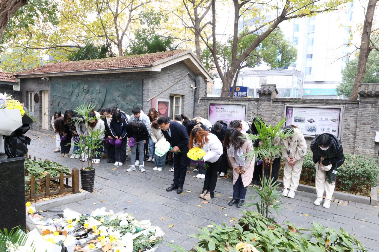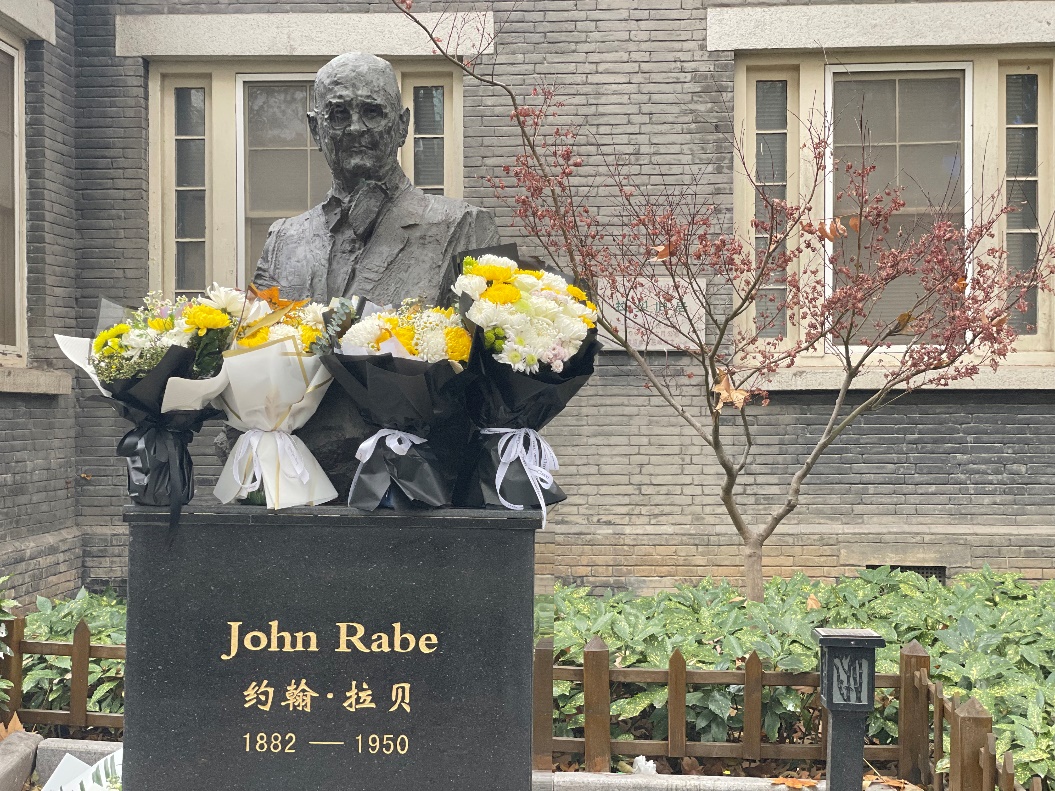 在拉贝先生的雕像前,国际学院师生向拉贝先生献花、脱帽鞠躬,一起缅怀这位外国友人,致以最崇高的敬意。