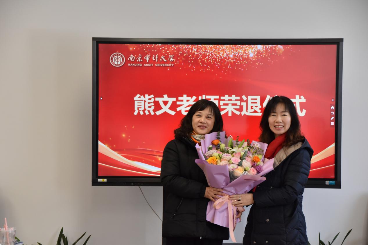 随后,学院为熊文老师举办荣退仪式。仪式上,学院副院长(主持)张文秀代表部门向熊文老师献花,并对熊文多年来为学院事业发展付出的心血和汗水表示感谢,希望老教师退休后健康平安,生活丰富多彩,继续关心和支持学院工作。