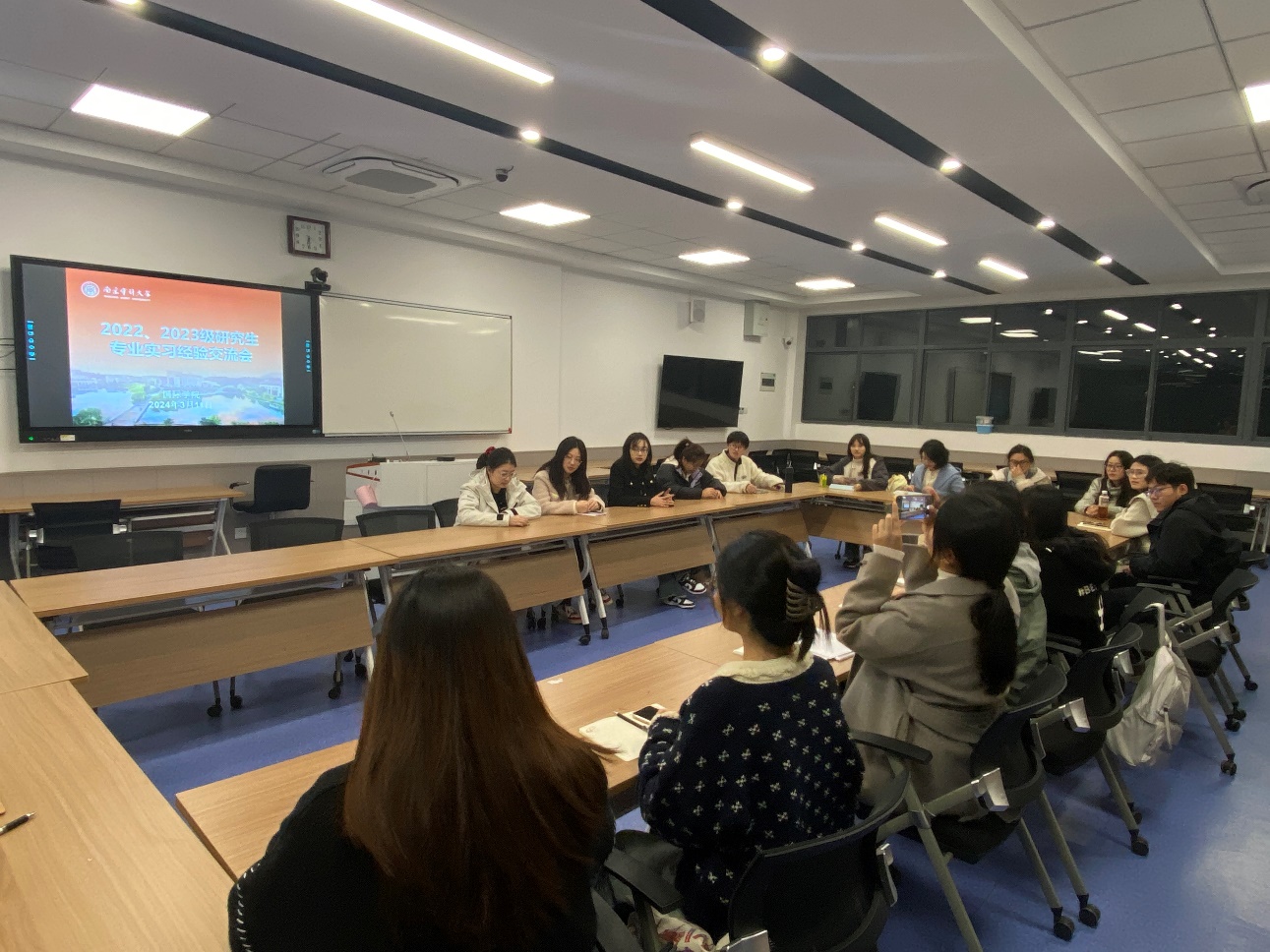 会上,2022级研究生分别对刚刚结束的实习实践情况一一做了总结汇报。大家畅所欲言,交流在不同实习岗位上获得的专业知识和宝贵经验,并在实习规划、实习时间和岗位等多个方面向2023级研究生提出了有针对性的意见建议。