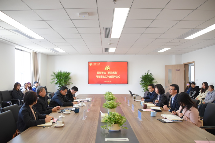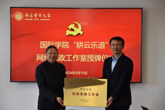 3月19日下午,国际学院“耕云乐道”网络思政工作室授牌仪式在莫愁校区综合楼802会议室举行。校党委副书记俞安平、党委常委、宣传部部长强飙、宣传部副部长唐小芳、宣传部新闻与新媒体中心主任潘洪波出席,国际学院全体领导班子成员及师生代表齐聚一堂,共同见证这一重要时刻,仪式由国际学院党委书记江振春主持。