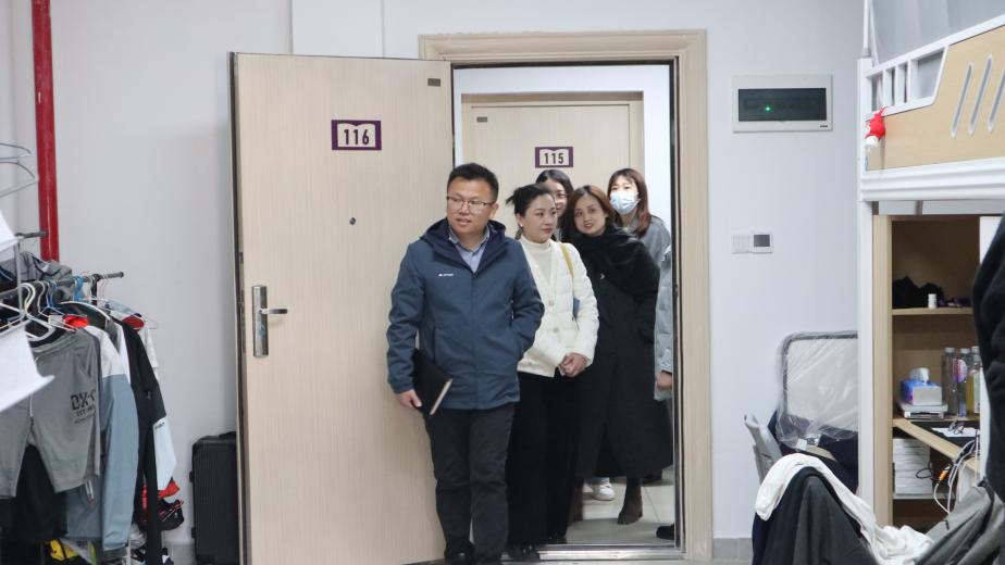 调研组一行参观了莫愁校区,并重点走访了学生公寓。调研组与宿管员阿姨进行面对面交流,了解宿舍管理模式,询问人脸识别系统运作流程,询问学生回寝时间和晚签到情况。来到学生宿舍,仔细查看了消防安全通道、逃生窗配置、床板护栏高度、公共卫生状况等。