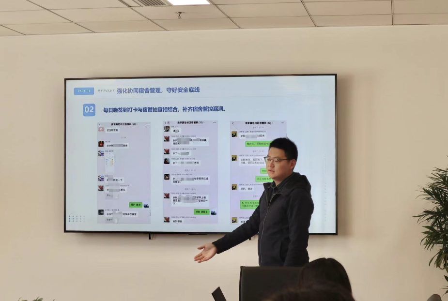 学院分团委书记倪冉汇报了莫愁校区学生日常管理工作的情况,重点对校区道闸系统、消防安全体系、智慧化建设等方面进行介绍。