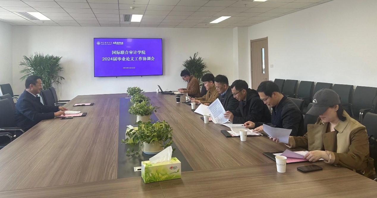 为推进毕业论文工作,加强毕业论文审核与指导,3月22日下午,国际联合审计学院召开2024届毕业论文工作协调会。金融学院党委书记谷政、郭风龙、内部审计学院周敏李、计算机学院姚兴山、工程审计学院付倩、国际联合审计学院副院长李庭燎参加会议,会议由李庭燎主持。